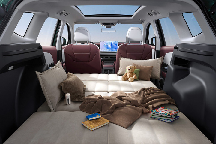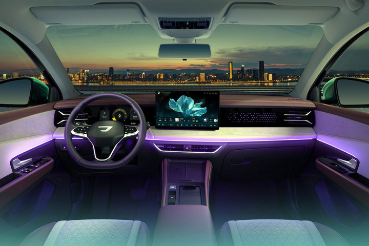 这里没有单独的空调控制单元—所有设置都集成在触摸屏中。中央通道上有一个无线充电板一个覆盖的盒子以及几个物理按钮。从换挡杆来看,换挡操作似乎是由副驾驶侧的旋钮完成的。设备清单中还包括数字仪表板、全景顶和车内氛围灯。